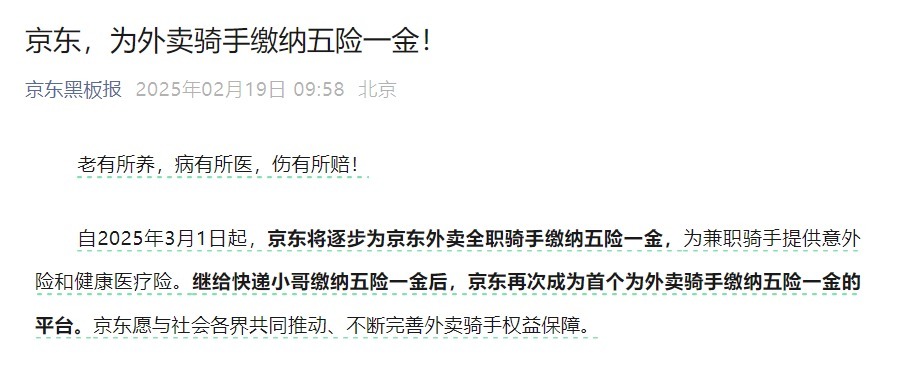 2月19日,根据京东官方公众号京东黑板消息,自2025年3月1日起,京东将逐步为京东外卖全职骑手缴纳五险一金,为兼职骑手提供意外险和健康医疗险。继给快递小哥缴纳五险一金后,京东再次成为首个为外卖骑手缴纳五险一金的平台。京东愿与社会各界共同推动、不断完善外卖骑手权益保障。